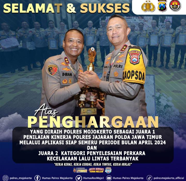 Mojokerto Penghargaan sebagai Juara 1 dalam Penilaian Kinerja Polres Jajaran Polda Jawa Timur melalui Aplikasi SIAP Semeru periode bulan April 2024 adalah bukti nyata dedikasi, kerja keras, dan komitmen yang luar biasa dari seluruh anggota Polres Mojokerto dalam memberikan pelayanan terbaik kepada masyarakat.