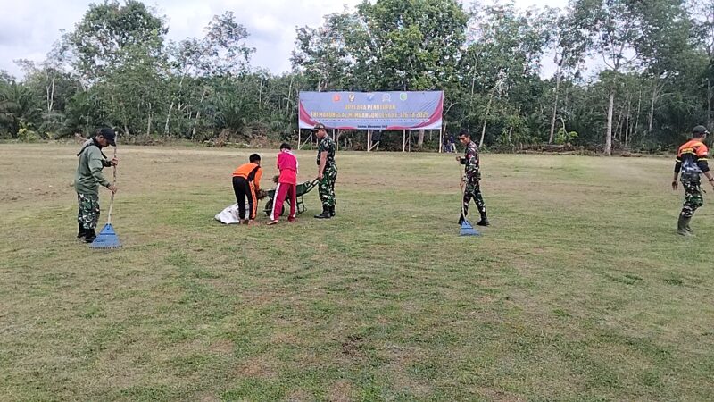 Sambas – Menjelang upacara penutupan TNI Manunggal Membangun Desa (TMMD) Reguler ke-126 Kodim 1208/Sambas, suasana gotong royong tampak di lokasi kegiatan. Satgas TMMD bersama warga, termasuk anak-anak Desa Ratu Sepudak, bahu-membahu memasang tenda yang akan digunakan untuk acara penutupan tersebut, Rabu (05/11/25).