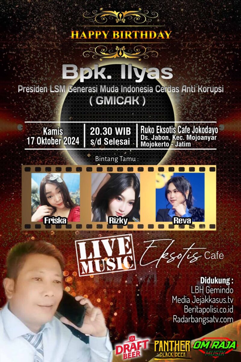 Mojokerto, 17 Oktober 2024 – Suasana meriah menyelimuti Ruko Eksotis Cafe Jokodayo di Desa Jabon, Kecamatan Mojoanyar, Mojokerto, pada Kamis malam (17/10/2024) dalam rangka merayakan ulang tahun Presiden LSM Generasi Muda Indonesia Cerdas Anti Korupsi (GMICAK), Bapak Liyas. Acara yang digelar mulai pukul 20.30 WIB hingga selesai ini dihadiri oleh berbagai kalangan serta para tamu undangan yang memberikan warna tersendiri dalam malam penuh kebahagiaan tersebut.