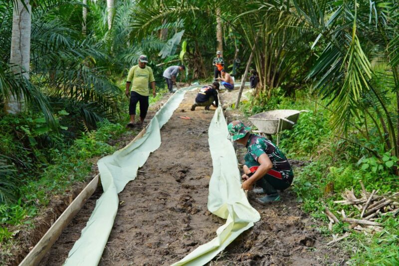 Sambas, — Demi menjaga kualitas hasil pembangunan, Satgas TNI Manunggal Membangun Desa (TMMD) ke-126 Kodim 1208/Sambas terus melaksanakan pekerjaan dengan penuh ketelitian. Salah satunya dengan melakukan pemasangan plastik pada mal rabat beton di Desa Ratu Sepudak, Kecamatan Galing, Kabupaten Sambas.