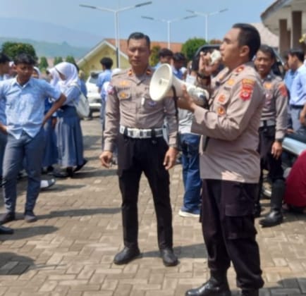 Kapolsek Majalaya Memimpin langsung Sosialisasi Larangan Penggunaan Knalpot No Standar di SMAN 2 Majalaya.