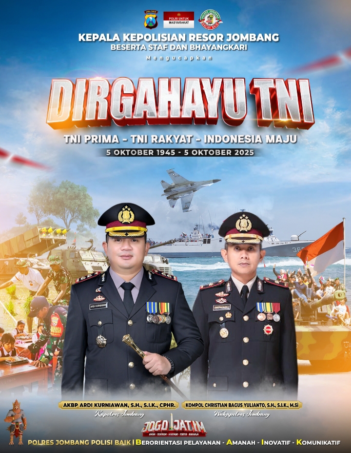Jombang, 5 Oktober 2025 – Dalam rangka memperingati Hari Ulang Tahun Tentara Nasional Indonesia (TNI) ke-80, Kepala Kepolisian Resor Jombang, AKBP Ardi Kurniawan, S.H., S.I.K., CPHR., bersama seluruh jajaran staf, personel, dan Bhayangkari, menyampaikan ucapan selamat dan apresiasi setinggi-tingginya kepada TNI atas dedikasi dan pengabdiannya dalam menjaga kedaulatan serta keutuhan Negara Kesatuan Republik Indonesia.