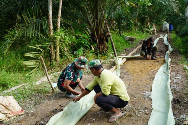 Pemasangan mal dan plastik ini bertujuan untuk menjaga kualitas hasil pengecoran agar rapi dan kuat sesuai standar teknis yang telah ditetapkan. Dengan semangat gotong royong, anggota Satgas dan masyarakat bahu-membahu menyelesaikan pekerjaan meskipun di bawah terik matahari.