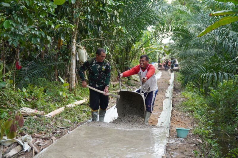 Kerja keras dan semangat gotong royong tampak jelas di wajah para prajurit dan masyarakat yang bahu-membahu mengangkut material menggunakan arko dan meratakan adonan semen untuk mempercepat penyelesaian pembangunan jalan rabat beton.