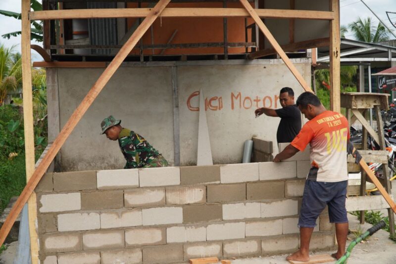 Satgas TMMD Kodim 1208/Sambas Lanjutkan Perehaban Poskamling, Masuki Tahap Pemasangan Batako
