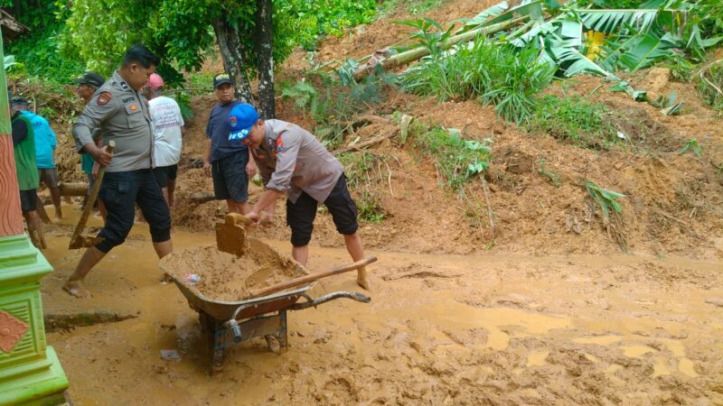 NGAWI, -;Personel Polsek Sine jajaran Polres Ngawi Polda Jatim bersama dengan TNI, relawan dari EPEJE dan Garasi serta masyarakat sekitar membantu evakuasi dan kerja bakti di lokasi bencana tanah longsor Desa Wonosari dan Desa Pocol Kecamatan Sine Kabupaten Ngawi, Senin (16/12/2024).